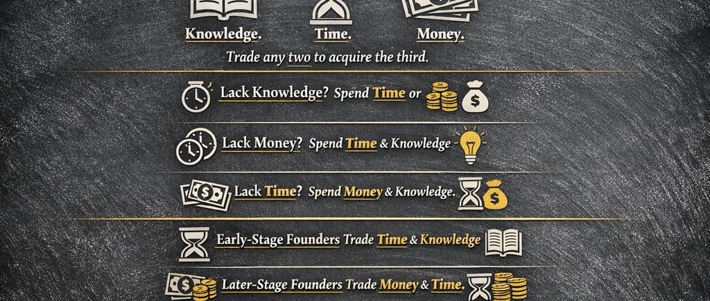 Consider knowledge first. When you lack knowledge about a market, a technology, a process you have two primary options. You can spend time learning through experimentation, reading, and iteration. Or you can spend money by hiring someone who already has that expertise. There is no third option. Every shortcut is simply a disguised trade between these same currencies.