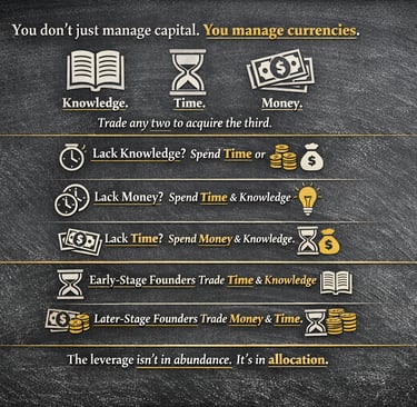 Now consider money. When money is scarce, as it is for most early-stage founders, you compensate by investing time and knowledge. You build instead of buying. You experiment instead of outsourcing. You accept inefficiency in the short term because capital is unavailable in the present. This is not a flaw in early-stage companies; it is their defining characteristic.